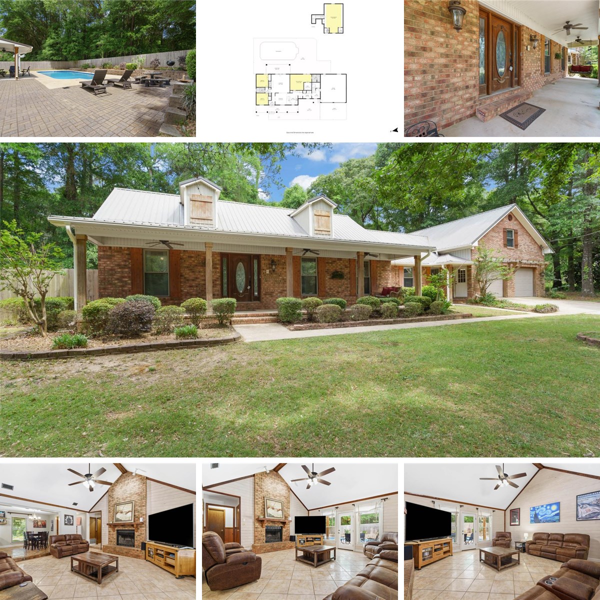Inside, you’re welcomed by a large front porch and foyer that opens into a sunken living room featuring high ceilings and a brick wood-burning fireplace. Step directly out back to your private, fenced pool area with a covered porch—set up perfectly for entertaining or unwinding at the end of the day.